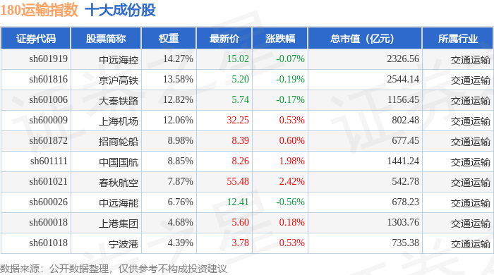 证券之星消息,11月5日,180运输(000027)指数报收于771.99点,涨0.41%,成交52.58亿元,换手率0.34%。当日该指数成份股中,上涨的有7家,春秋航空以2.42%的涨幅领涨,下跌的有6家,青岛港以0.69%的跌幅领跌。