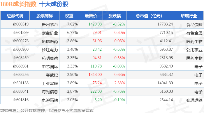 180R成长(000030)指数十大成份股详情如下: