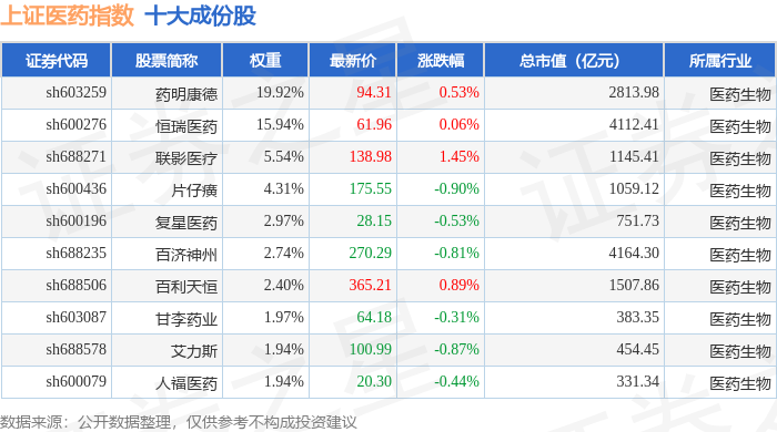 证券之星消息,11月5日,上证医药(000037)指数报收于6692.8点,涨0.09%,成交183.38亿元,换手率0.81%。当日该指数成份股中,上涨的有21家,惠泰医疗以5.42%的涨幅领涨,下跌的有27家,三生国健以8.47%的跌幅领跌。