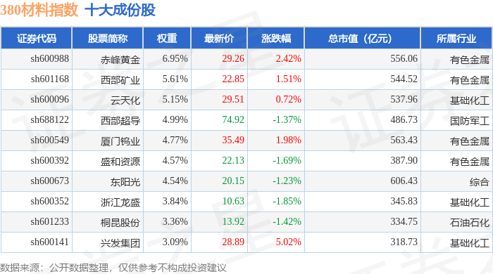证券之星消息,11月5日,380材料(000105)指数报收于4999.49点,涨0.73%,成交226.59亿元,换手率1.82%。当日该指数成份股中,上涨的有32家,兴发集团以5.02%的涨幅领涨,下跌的有15家,浙江龙盛以1.85%的跌幅领跌。