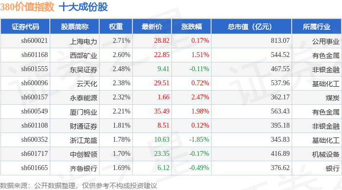 证券之星消息,11月5日,380价值(000118)指数报收于10167.89点,涨0.66%,成交426.04亿元,换手率1.63%。当日该指数成份股中,上涨的有77家,喜临门以9.98%的涨幅领涨,下跌的有35家,厦门银行以2.26%的跌幅领跌。