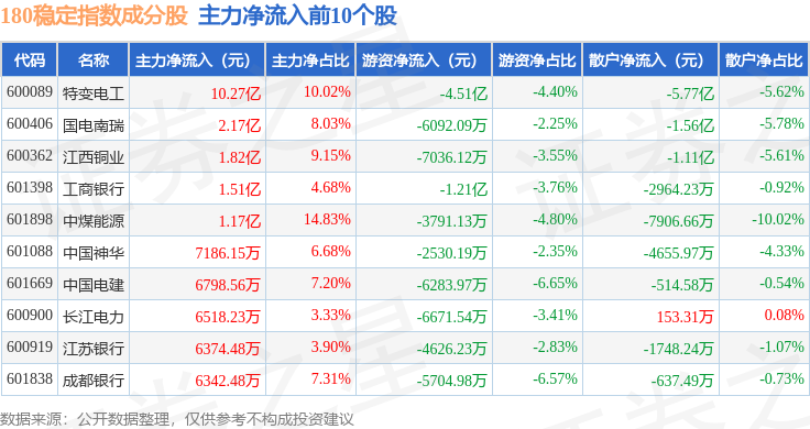 资金流向方面,180稳定(000125)指数成份股当日主力资金净流入合计7.2亿元,游资资金净流出合计8.18亿元,散户资金净流入合计9760.96万元。成份股资金流向详情见下表: