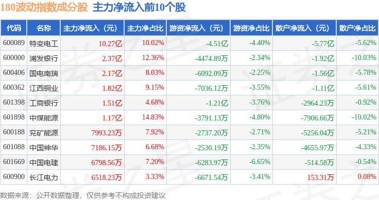资金流向方面,180波动(000129)指数成份股当日主力资金净流入合计9.12亿元,游资资金净流出合计8.84亿元,散户资金净流出合计2750.11万元。成份股资金流向详情见下表: