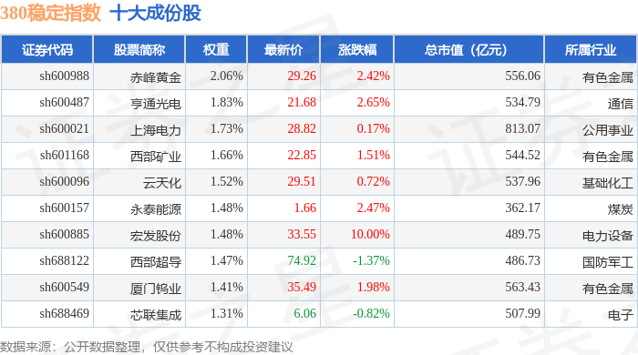 380稳定(000142)指数十大成份股详情如下: