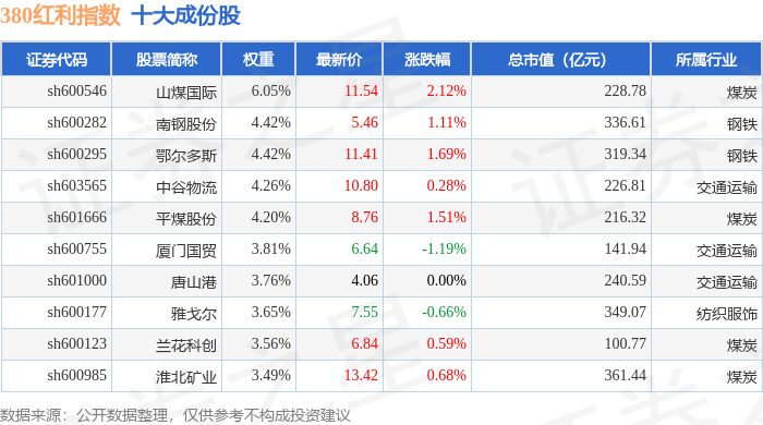 证券之星消息,11月5日,380红利(000150)指数报收于12267.76点,涨0.35%,成交73.79亿元,换手率1.06%。当日该指数成份股中,上涨的有22家,山煤国际以2.12%的涨幅领涨,下跌的有6家,厦门银行以2.26%的跌幅领跌。