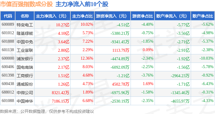 资金流向方面,市值百强(000155)指数成份股当日主力资金净流出合计22.78亿元,游资资金净流入合计3.46亿元,散户资金净流入合计19.32亿元。成份股资金流向详情见下表: