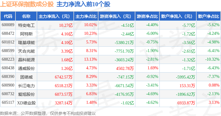 资金流向方面,上证环保(000158)指数成份股当日主力资金净流入合计26.88亿元,游资资金净流出合计11.47亿元,散户资金净流出合计15.42亿元。成份股资金流向详情见下表: