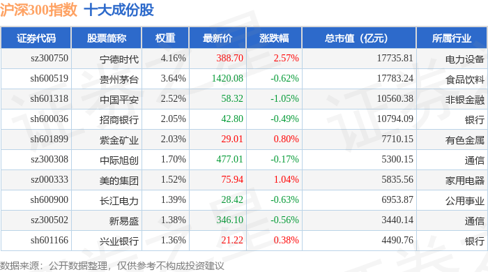 沪深300(000300)指数十大成份股详情如下: