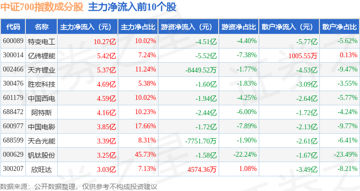 资金流向方面,中证700(000907)指数成份股当日主力资金净流出合计54.55亿元,游资资金净流入合计7.1亿元,散户资金净流入合计47.45亿元。成份股资金流向详情见下表: