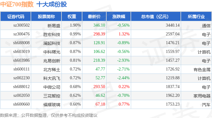 证券之星消息,11月5日,中证700(000907)指数报收于6348.83点,涨0.22%,成交5532.66亿元,换手率1.55%。当日该指数成份股中,上涨的有363家,阿特斯以20.02%的涨幅领涨,下跌的有316家,光弘科技以7.95%的跌幅领跌。