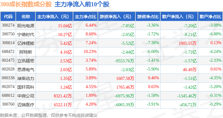 资金流向方面,300成长(000918)指数成份股当日主力资金净流出合计10.28亿元,游资资金净流出合计4.07亿元,散户资金净流入合计14.36亿元。成份股资金流向详情见下表: