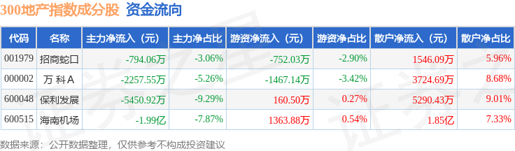资金流向方面,300地产(000952)指数成份股当日主力资金净流出合计2.84亿元,游资资金净流出合计694.79万元,散户资金净流入合计2.91亿元。成份股资金流向详情见下表: