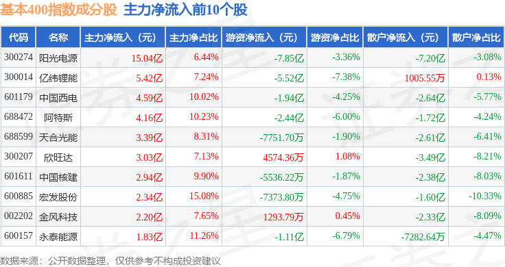 资金流向方面,基本400(000966)指数成份股当日主力资金净流出合计8.99亿元,游资资金净流入合计6484.99万元,散户资金净流入合计8.34亿元。成份股资金流向详情见下表: