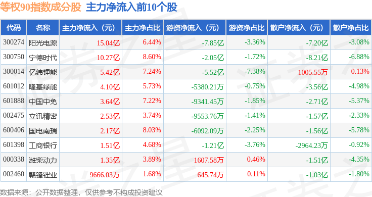 资金流向方面,等权90(000971)指数成份股当日主力资金净流出合计24.45亿元,游资资金净流入合计1.01亿元,散户资金净流入合计23.45亿元。成份股资金流向详情见下表: