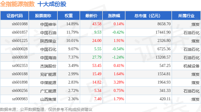 全指能源(000986)指数十大成份股详情如下: