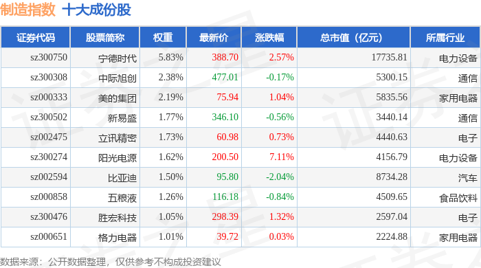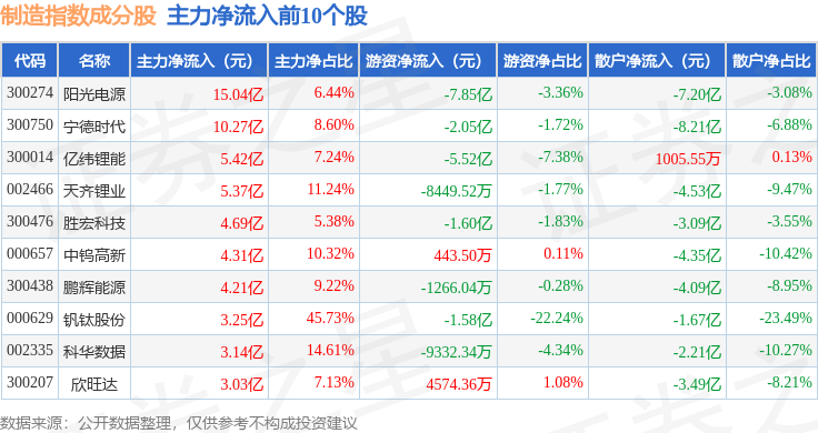 资金流向方面,制造指数(399233)成份股当日主力资金净流入合计6.89亿元,游资资金净流出合计42.6亿元,散户资金净流入合计35.71亿元。成份股资金流向详情见下表: