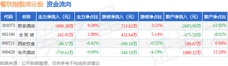资金流向方面,餐饮指数(399238)成份股当日主力资金净流入合计1313.12万元,游资资金净流入合计705.57万元,散户资金净流出合计2018.7万元。成份股资金流向详情见下表: