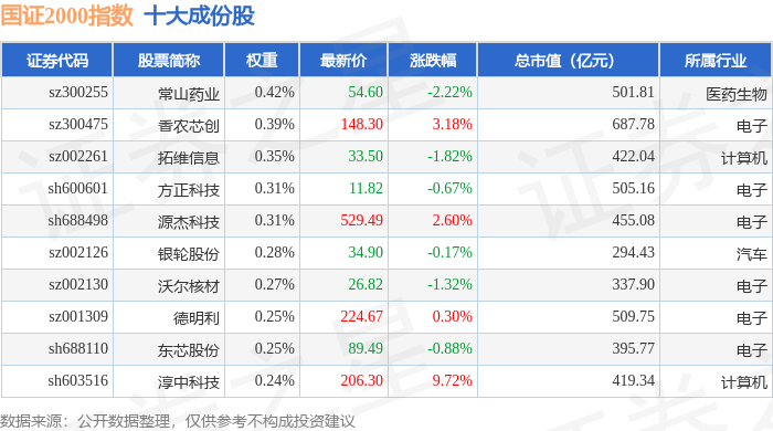 证券之星消息,11月5日,国证2000(399303)指数报收于9711.46点,涨0.5%,成交5818.54亿元,换手率3.23%。当日该指数成份股中,上涨的有1224家,双杰电气以20.02%的涨幅领涨,下跌的有724家,百合花以10.01%的跌幅领跌。