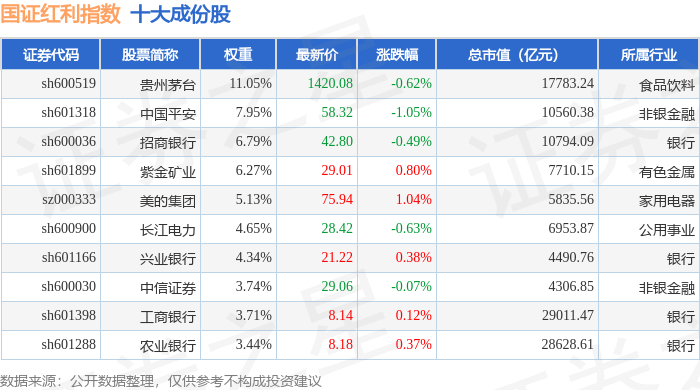 证券之星消息,11月5日,国证红利(399321)指数报收于7693.15点,跌0.1%,成交672.16亿元,换手率0.26%。当日该指数成份股中,上涨的有17家,潍柴动力以3.93%的涨幅领涨,下跌的有32家,中国海油以1.24%的跌幅领跌。