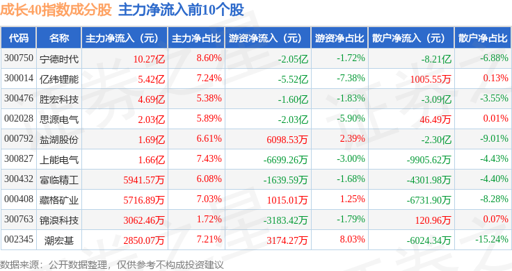资金流向方面,成长40(399326)指数成份股当日主力资金净流入合计17.32亿元,游资资金净流出合计8.68亿元,散户资金净流出合计8.65亿元。成份股资金流向详情见下表: