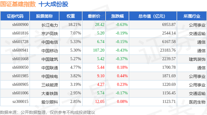 证券之星消息,11月5日,国证基建(399359)指数报收于2740.29点,涨0.06%,成交231.24亿元,换手率0.47%。当日该指数成份股中,上涨的有32家,中国核建以5.86%的涨幅领涨,下跌的有16家,电投能源以1.4%的跌幅领跌。