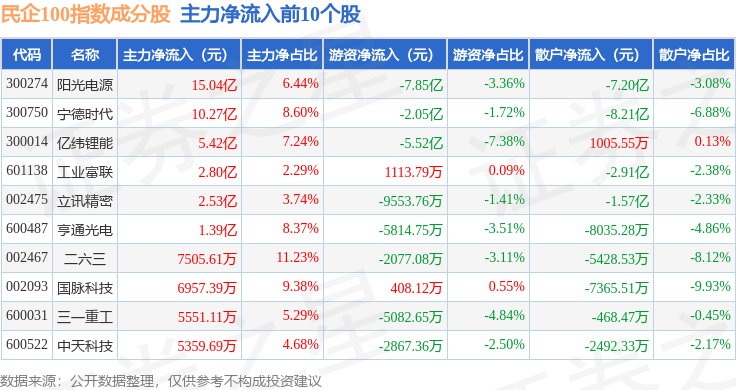资金流向方面,民企100(399362)指数成份股当日主力资金净流出合计11.86亿元,游资资金净流出合计2935.14万元,散户资金净流入合计12.15亿元。成份股资金流向详情见下表: