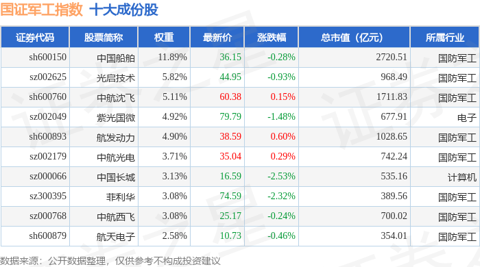 证券之星消息,11月5日,国证军工(399368)指数报收于7655.65点,跌0.34%,成交234.68亿元,换手率1.11%。当日该指数成份股中,上涨的有19家,中船防务以2.31%的涨幅领涨,下跌的有30家,国博电子以3.35%的跌幅领跌。