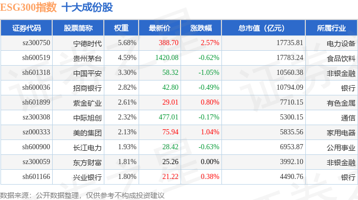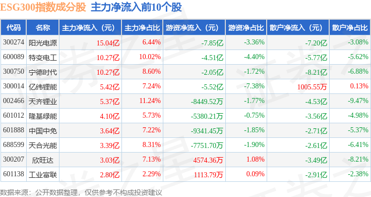 资金流向方面,ESG300(399378)指数成份股当日主力资金净流入合计11.24亿元,游资资金净流出合计1.98亿元,散户资金净流出合计9.26亿元。成份股资金流向详情见下表: