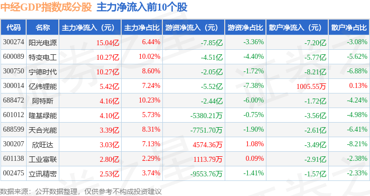 资金流向方面,中经GDP(399399)指数成份股当日主力资金净流入合计37.18亿元,游资资金净流出合计26.1亿元,散户资金净流出合计11.08亿元。成份股资金流向详情见下表: