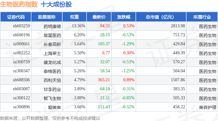 生物医药(399441)指数十大成份股详情如下: