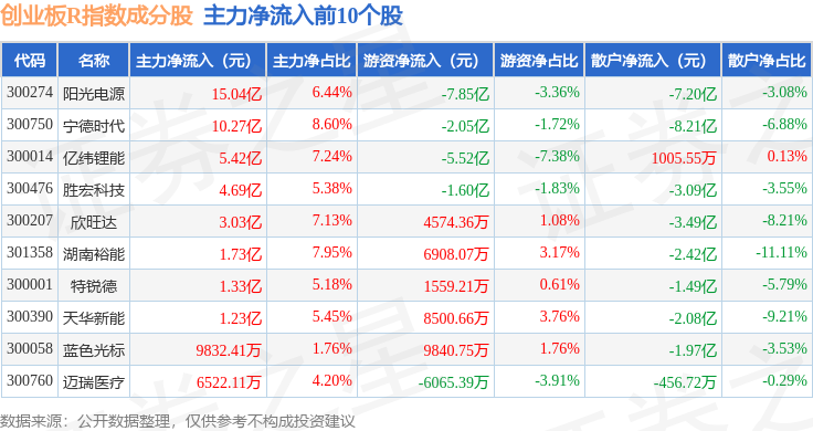 资金流向方面,创业板R(399606)指数成份股当日主力资金净流出合计1.21亿元,游资资金净流入合计1.61亿元,散户资金净流出合计4063.11万元。成份股资金流向详情见下表: