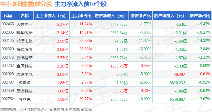 资金流向方面,中小基础(399623)指数成份股当日主力资金净流出合计21.23亿元,游资资金净流出合计8.0亿元,散户资金净流入合计29.23亿元。成份股资金流向详情见下表:
