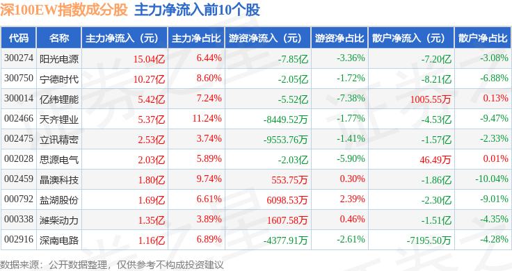 资金流向方面,深100EW(399632)指数成份股当日主力资金净流出合计9.51亿元,游资资金净流出合计3.07亿元,散户资金净流入合计12.58亿元。成份股资金流向详情见下表: