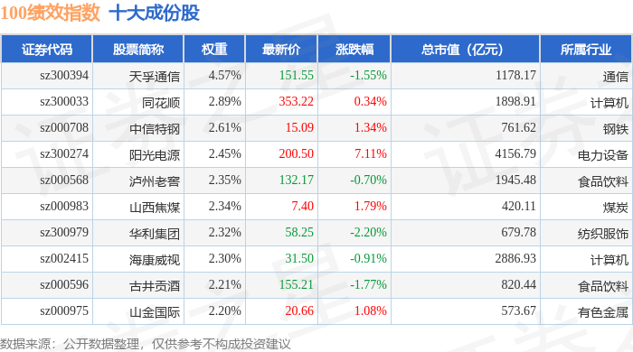 100绩效(399656)指数十大成份股详情如下: