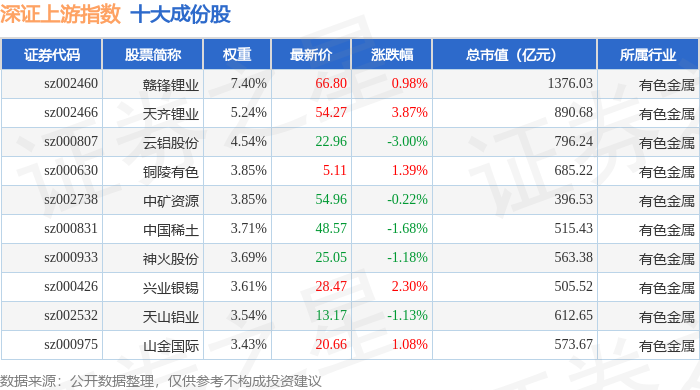 证券之星消息,11月5日,深证上游(399704)指数报收于5993.36点,涨0.77%,成交508.73亿元,换手率2.79%。当日该指数成份股中,上涨的有32家,钒钛股份以10.17%的涨幅领涨,下跌的有17家,云铝股份以3.0%的跌幅领跌。