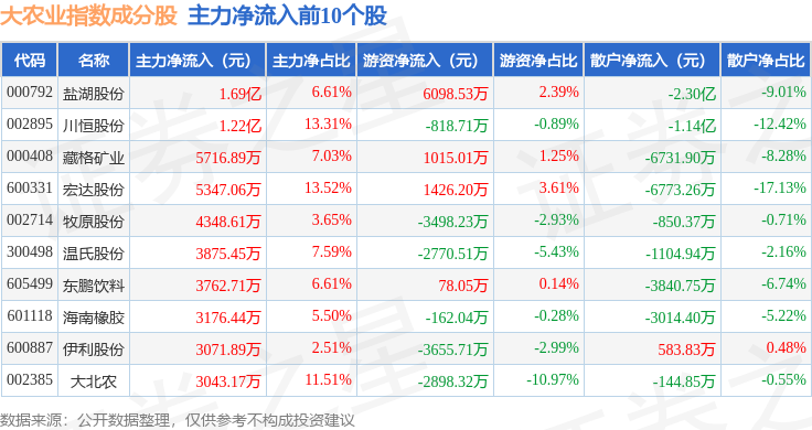 资金流向方面,大农业(399814)指数成份股当日主力资金净流入合计4.92亿元,游资资金净流入合计2552.49万元,散户资金净流出合计5.18亿元。成份股资金流向详情见下表: