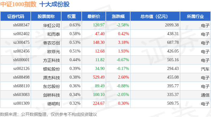 中证1000(399852)指数十大成份股详情如下: