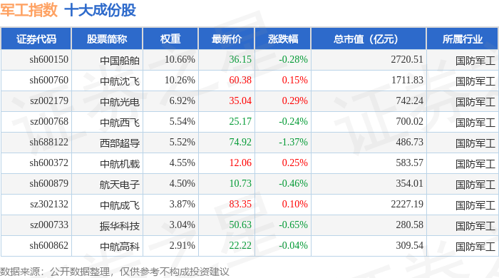 资金流向方面,军工指数(399959)成份股当日主力资金净流出合计5.79亿元,游资资金净流入合计2.36亿元,散户资金净流入合计3.42亿元。成份股资金流向详情见下表: