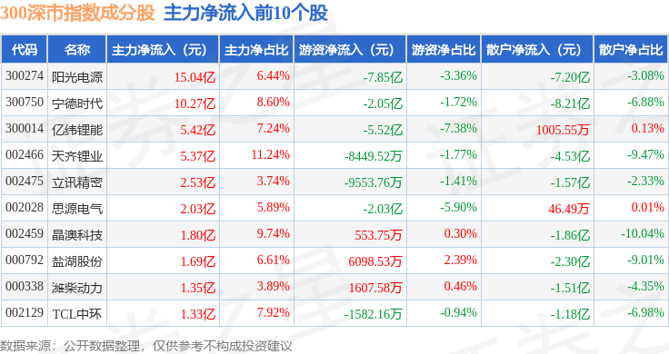资金流向方面,300深市(399972)指数成份股当日主力资金净流出合计5.72亿元,游资资金净流出合计2.96亿元,散户资金净流入合计8.68亿元。成份股资金流向详情见下表: