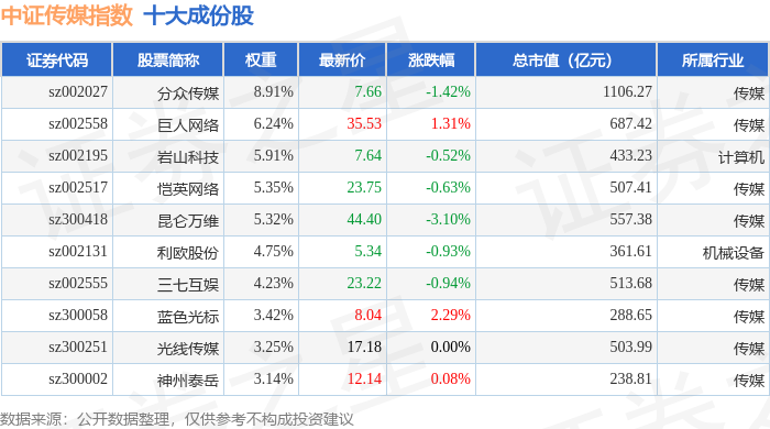 证券之星消息,11月5日,中证传媒(399971)指数报收于1488.01点,跌0.37%,成交392.74亿元,换手率3.39%。当日该指数成份股中,上涨的有25家,中国电影以10.01%的涨幅领涨,下跌的有24家,完美世界以6.01%的跌幅领跌。