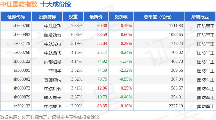 资金流向方面,中证国防(399973)指数成份股当日主力资金净流出合计8.82亿元,游资资金净流入合计2.2亿元,散户资金净流入合计6.63亿元。成份股资金流向详情见下表: