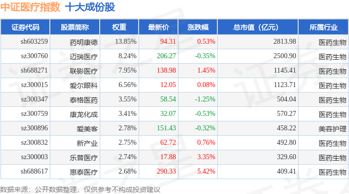 证券之星消息,11月5日,中证医疗(399989)指数报收于7234.37点,涨0.2%,成交174.34亿元,换手率1.3%。当日该指数成份股中,上涨的有24家,惠泰医疗以5.42%的涨幅领涨,下跌的有25家,华熙生物以3.82%的跌幅领跌。