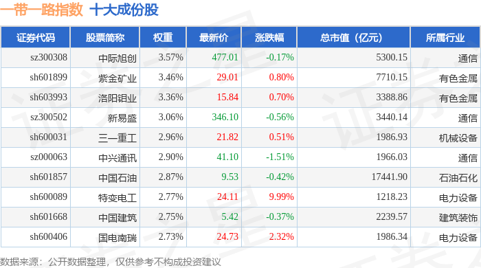 一带一路(399991)指数十大成份股详情如下:
