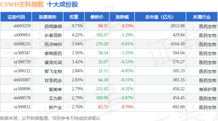 CSWD生科(399993)指数十大成份股详情如下: