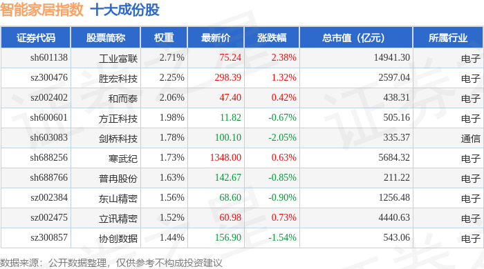 证券之星消息,11月5日,智能家居(399996)指数报收于4430.81点,跌0.22%,成交1169.85亿元,换手率1.56%。当日该指数成份股中,上涨的有39家,蓝特光学以3.83%的涨幅领涨,下跌的有60家,芒果超媒以3.78%的跌幅领跌。