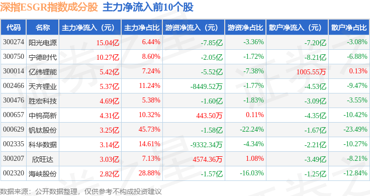 资金流向方面,深指ESGR(470026)指数成份股当日主力资金净流出合计18.31亿元,游资资金净流出合计4.38亿元,散户资金净流入合计22.69亿元。成份股资金流向详情见下表: