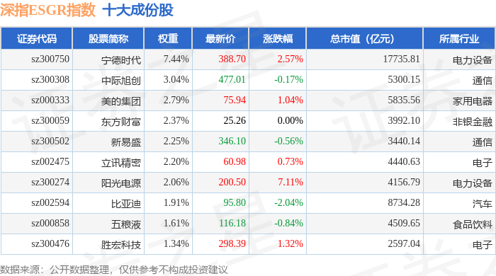证券之星消息,11月5日,深指ESGR(470026)指数报收于18943.5点,涨0.42%,成交4073.77亿元,换手率1.65%。当日该指数成份股中,上涨的有202家,东方日升以11.15%的涨幅领涨,下跌的有188家,完美世界以6.01%的跌幅领跌。