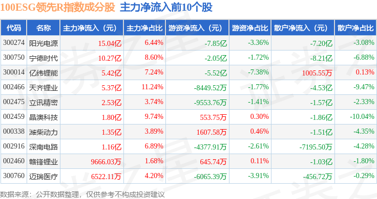资金流向方面,100ESG领先R(470030)指数成份股当日主力资金净流入合计7.81亿元,游资资金净流出合计7.76亿元,散户资金净流出合计535.81万元。成份股资金流向详情见下表: