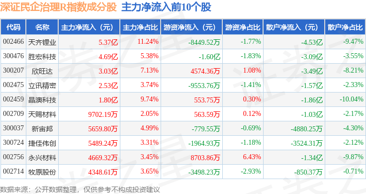 资金流向方面,深证民企治理R(470058)指数成份股当日主力资金净流出合计3.59亿元,游资资金净流入合计5.43亿元,散户资金净流出合计1.84亿元。成份股资金流向详情见下表: