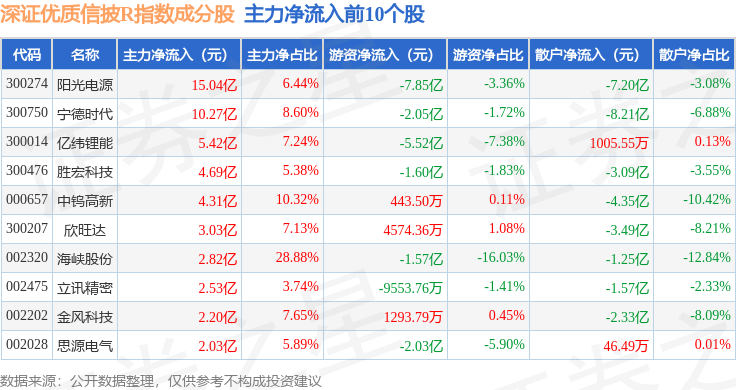 资金流向方面,深证优质信披R(470065)指数成份股当日主力资金净流出合计29.13亿元,游资资金净流出合计7.95亿元,散户资金净流入合计37.08亿元。成份股资金流向详情见下表:
